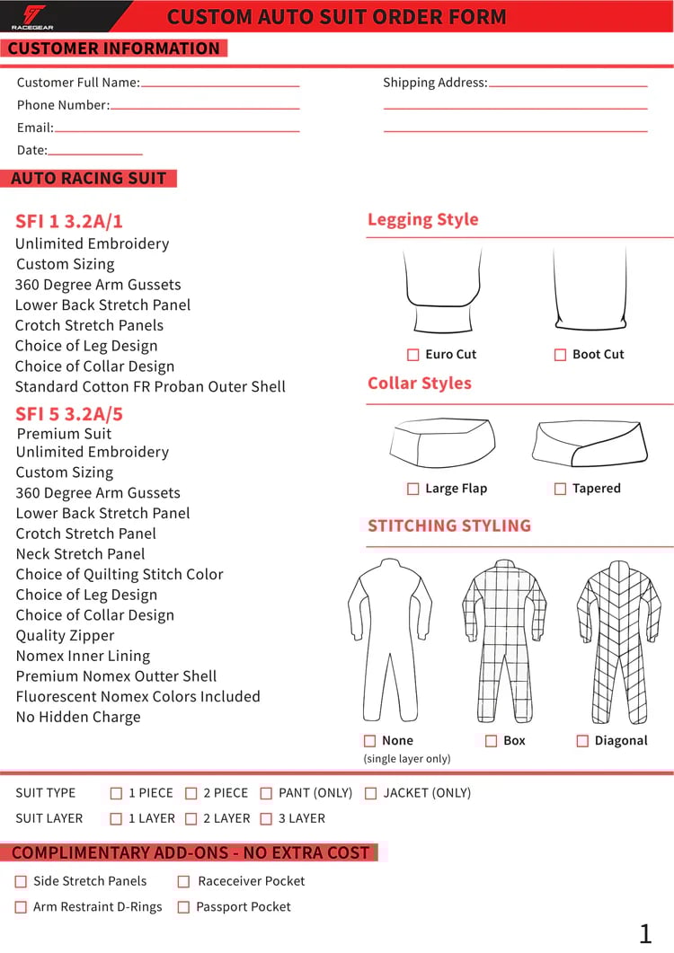 CUSTOM SFI AUTO DRIVER SUIT ORDER FORM